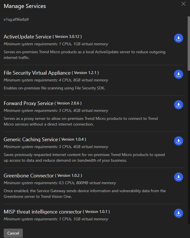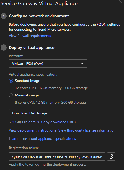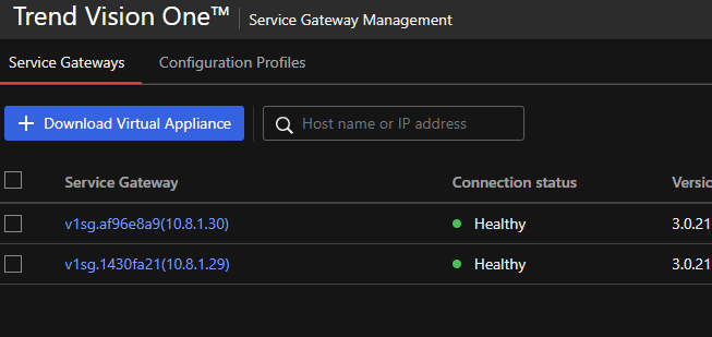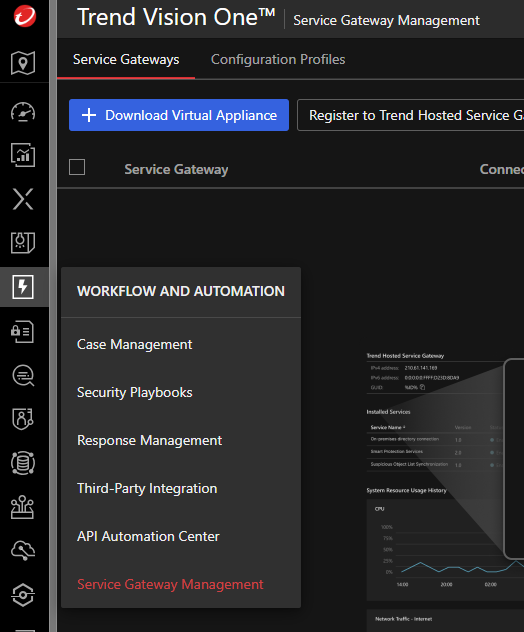 Trend Vision One ekranında Workflow And Automation ekranından Service Gateway Management tıklıyoruz . Download Virtual Appliance tıklayarak ortamımıza ait kurulum gereksinimi dosyayı indiriyoruz.