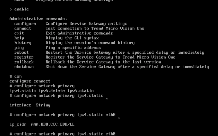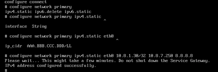 Configure network primary ipv4.static <interface> <ip_cidr> <gateway> <dns1> [dns2]