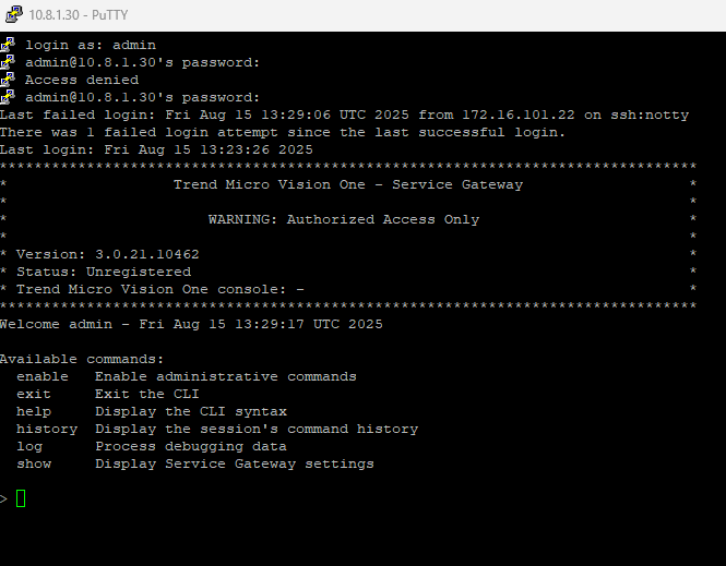 Tanımlama tamamlandıktan sonra ssh ile konsola erişip Trend Vision One kayıt işlemini gerçekleştiriyor olacağız. SSH için port açık olmadığı durumda portu network ayarlarından aktif etmemiz gerekebiliyor.